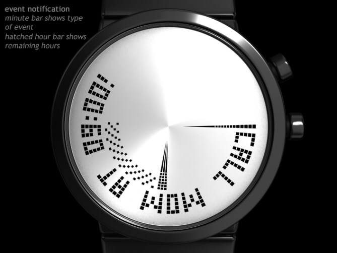 As for the notifications of events, I imagine one hand revealing information about the type of event and the remaining time or the time when the event is due while the other hand could get accompanied by a time bar that gives a quick impression of the time between now and the event. If the even is more than an hour away, the time bar is coming out of the hour hand and shows the remaining time in hours. If the event is less than an hour away, the time bar is coming out of the minute hand and shows the remaining time in minutes – more precise. A similar display could work for past events or unchecked notifications. The time bar would grow backwards in time, ending where the notification occurred. Caller details and message contents could expand from the watch hand without the time bar.