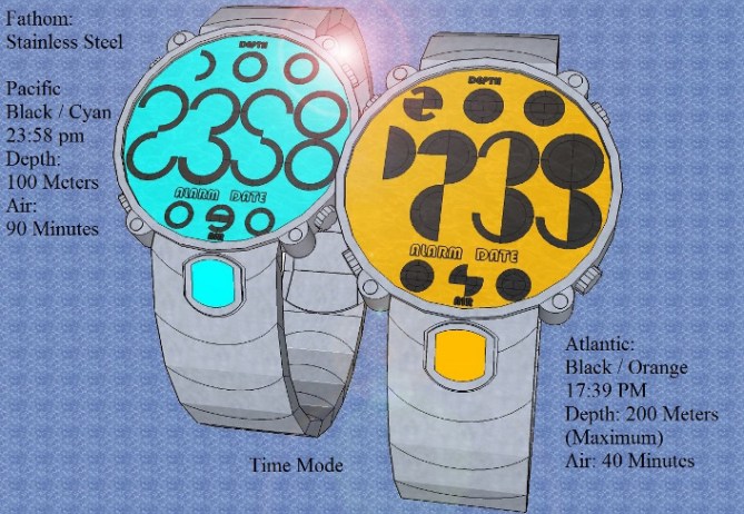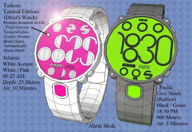 Andrew says: Fathom: Is my design concept for a waterproof diver’s wristwatch available in two display styles: Atlantic /Pacific. Each of which is available white Black or White Digits plus in various Materials: White Acetate, Black IP, Stainless Steel or Grey Shark Scaled: Rubber: See Diagrams Provided.