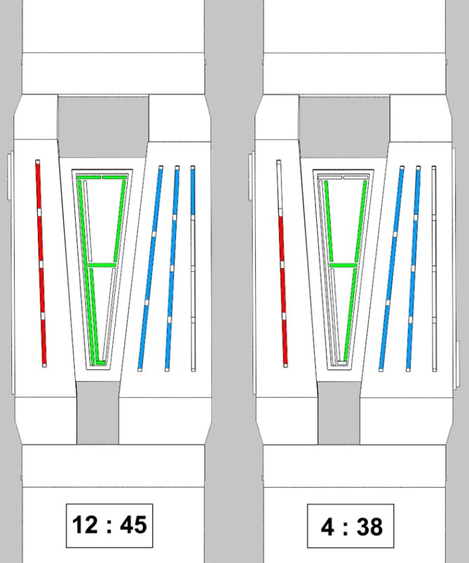 The monitor in the middle tell the hours by showing the numeric shapes. The right geometry has 3 lines, divided to 11 segments, each segment represents 5 mins. The left geometry has a single line divided to 4 segments each represents 1 min.