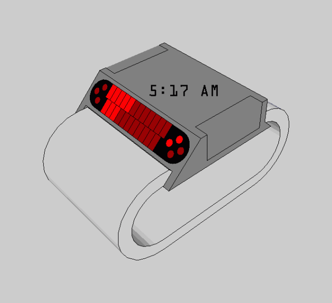 Matt says: This design was inspired by Peter “Predatime”. I reorganized the lights position, added alarm/date/pm options. I also made LCD’s displays example, since I prefer an always on screen vs. LED lights.