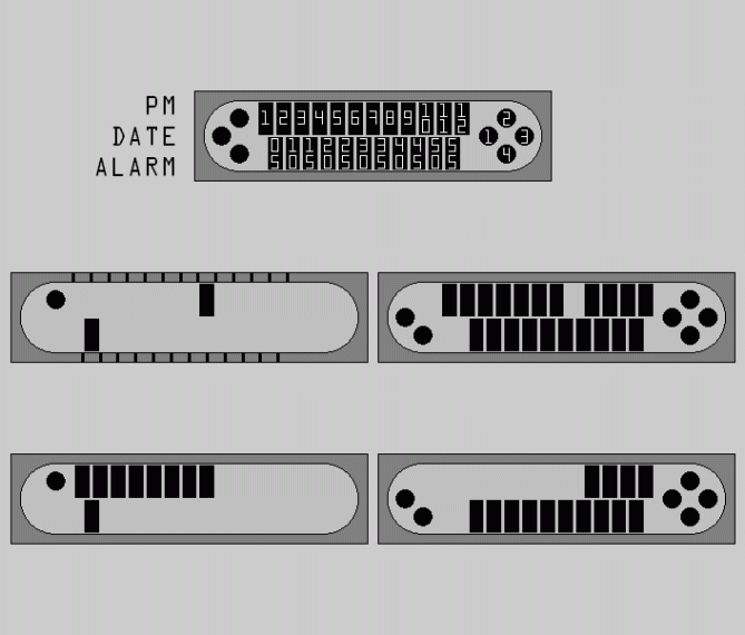 The hours use the blocks on the center/top row. The 5 minutes use the row of blocks under the hours. They can be a mirror of the hours, the 12th being a decoration, or have 11 & be slightly moved to the right. The 4 single minute use the 4 circles on the right, or left, starting at the center-left & going clockwise. The options use the 3 circles on the opposite side. The order is, top to bottom, pm/date/alarm.