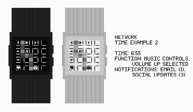 5. Very cool time telling method! I really like it. Have you tried an animation like this for the corners: _ | ? Nice little icons. I just wish the display wouldn’t look this ‘untidy’ with the network and the different icons places in the holes. Maybe a mere time telling watch would work too (what the bloggers tend to suggest for most of the smart watch concepts posted lately, and now I suggest it too). An continuous animated display.. and you know what, you could use one wire for the normal time and add 1,2,3,4 wires for additional minutes instead of the four additional dots. Aaaaanyway, this watch has some potential. As fo rthe smart part, maybe a separate display with the same width but 1/7 of the height of the main display would work here too. I like thinking about this concept and I hope Tokyoflash do too. 5*/YES
