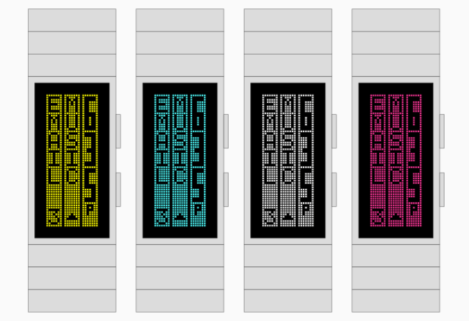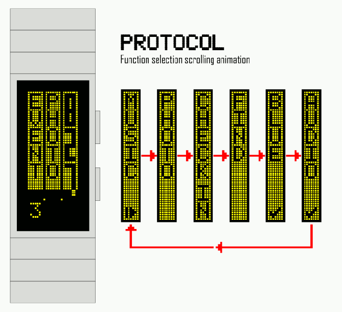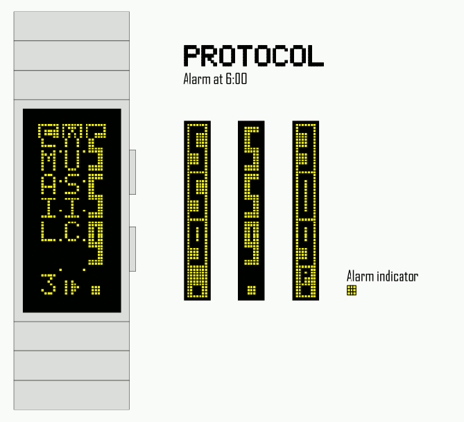 The watch uses a mixed positive and negative display. At the beginning of each minute, the display is all negative; at the end of each minute, the display is all positive; in between, the display is mixed. The display is 59 pixels high and the division between positive and negative sections advances each second. This seconds animation shows that the watch is alive and makes it possible to display the seconds while still having large and very legible hours and minutes digits. Every 10 seconds, small single-pixel counters appear between the three columns to make it easier to estimate the seconds.
