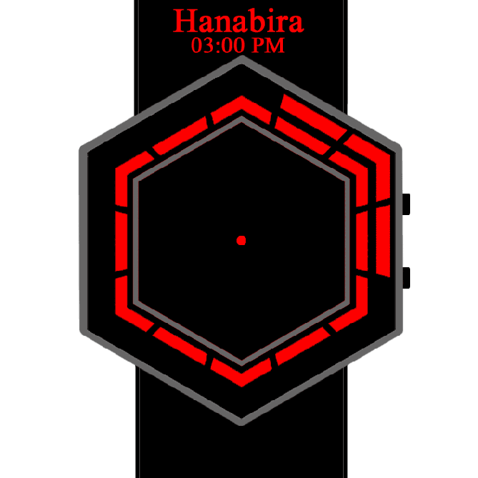 There are 24 simple hour indicators around the central hexagon. The axis of the virtual minute hand is wandering inside the central hexagon. It has six fixed positions. One position lasts for 10 minutes. The minute hand draws a six-petal flower in 60 minutes.