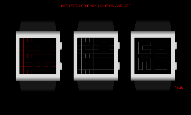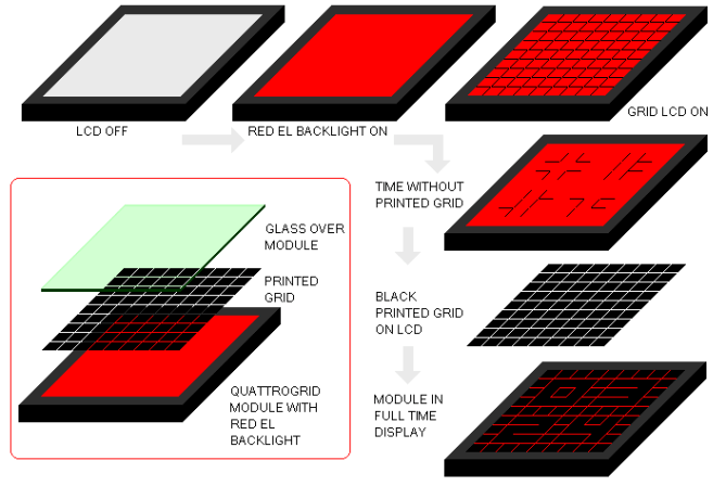 The EL luminous LCD module has 8×9 separate horizontal and 8×9 separate vertical lines, forming the square grid shaped graphic display. The LCD glass has a black checkered print of 81 squares between the gridlines. The luminous through the “open” gridlines displays the desired graphic for reading the time.