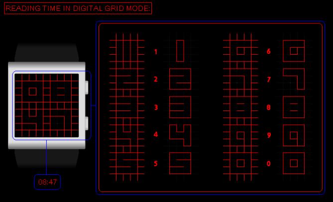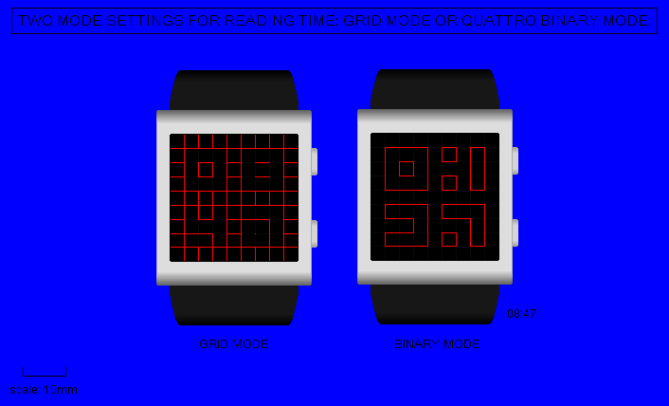 The uniqueness of the Quattrogrid lies in the display method that forms continious unbroken lines, unlike as in other digital displays, combined with choosing between two different time telling methods with the same graphics.