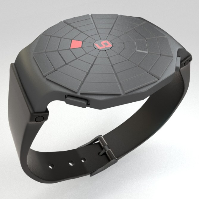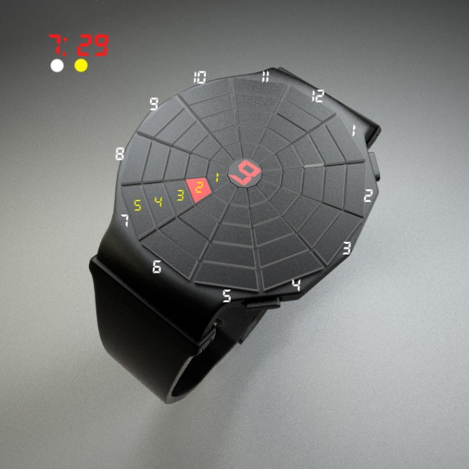 Gabriel says: I do not have a particular inspiration for this concept but as the clock display resembles a spider web, I thought to name it “web”. The watch has 60 segments that light up and in center a digital numeric display.