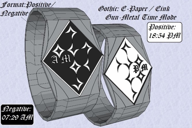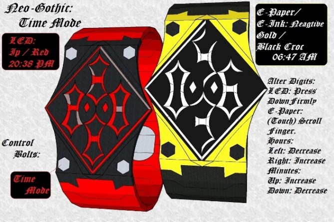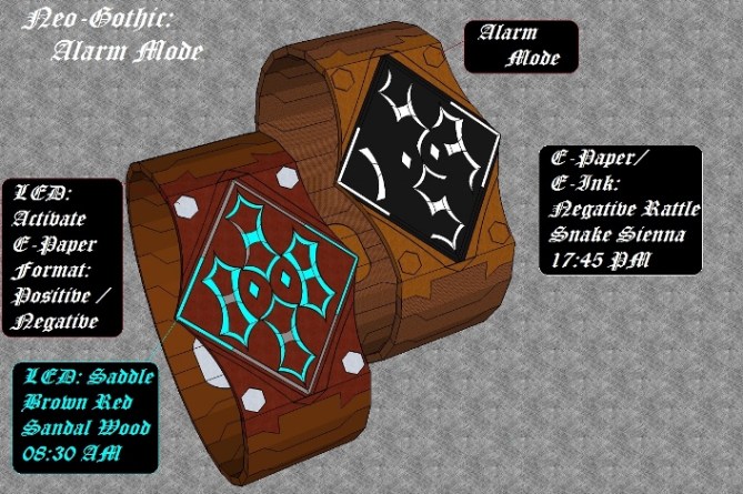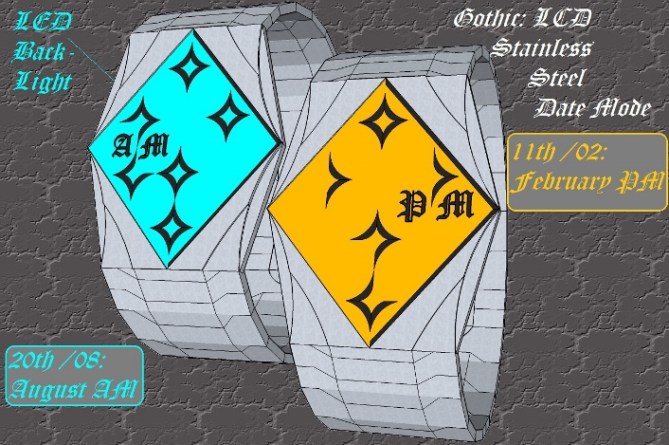 This lead to the “Gothic” wristwatch design. Which uses a: LED, LCD or E-paper / E-ink to display the time Display. Constructed in either: IP black, Gun-Metal or Stainless Steel This watch has three display modes: Alarm, Date & Time (Default).