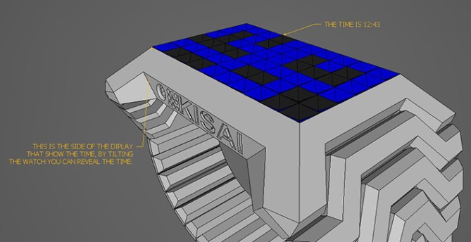 Pretty much this watch tells the time and date by tilting it a certain angle revealing the time. if you were to see the watch directly you wouldn’t be able to tell the time. but by tilting it you can easily decipher it. this watch has endless animations due to its square display that fits pretty much every type of application. but one that I really want this watch to do is able to play TETRIS with the help of the side buttons with multi command’s for every other application that this watch could possibility do.