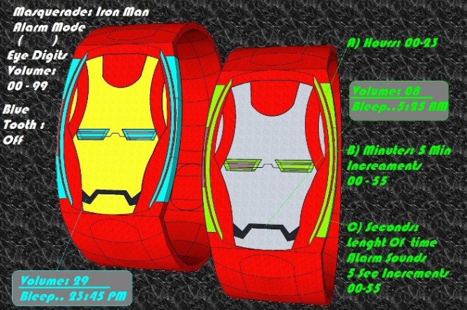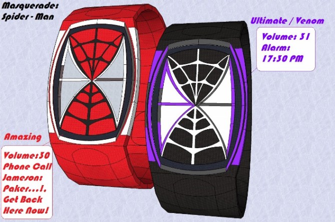 Andrew says: The following concept is for a series of taking / speaking character watches inspired by the following iconic characters: Iron Man, Spider-man & Electronic Music super stars: Daft Punk. Construed in various material that suit / replicate the look / style of the character represented on the face / display.