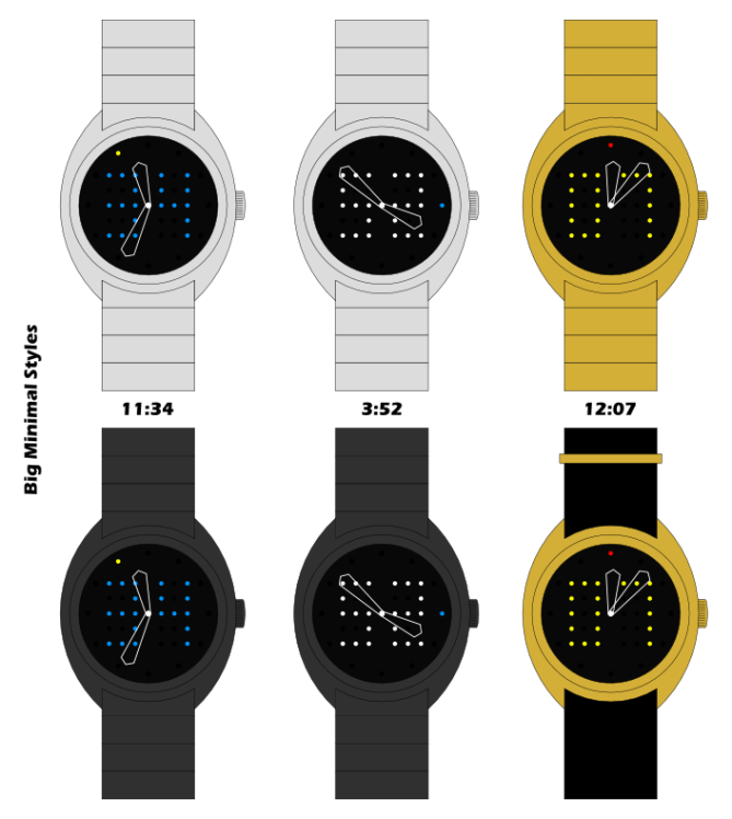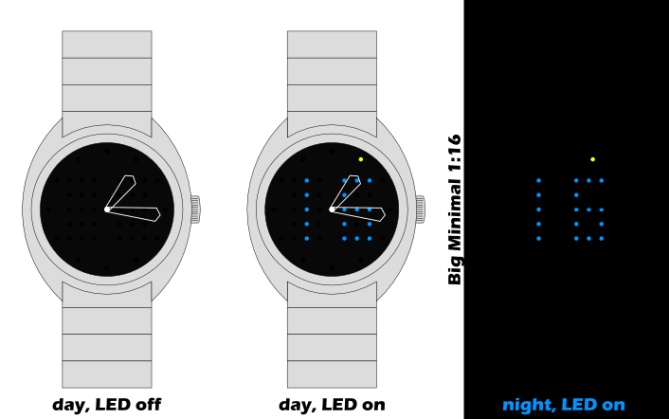 Big Minimal is an analog + LED watch where the LEDs enhance legibility on demand during the day or night.  With the LEDs off, during the day, two white hands on a blank charcoal dial convey the time with classic simplicity.  If you need to know the exact minute, pushing the crown activates the central LEDs embedded in the dial to display the minutes as big digits (and a clock-position LED for the hours).  The hands are large and skeletonized so they are both clear when the LEDs are off and do not obscure the LEDs when on.  At night, activating the LEDs gives a bright display cleaner than lume or backlighting.
