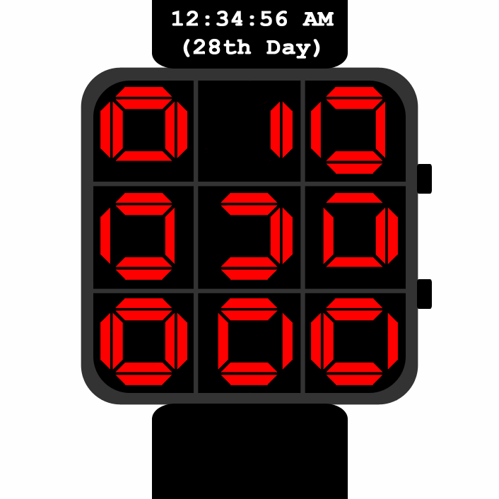 I used a 3×3 matrix screen for Hours/Months, Minutes/Days, Seconds, AM-PM-Date indicator and Days. It is a simple and classical design with new digits.