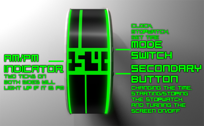 Vexel has 3 modes, with the top button changing between the three. The first mode is just the clock mode. If you press the secondary button while in clock mode, the screen turns on/off. The second mode is the stopwatch mode. For this mode, the hour hand becomes the minute hand, the minutes become seconds, and the second hand becomes the millisecond hand.When the time on the minute hand is at 12, it goes back to 0 and continues, but the pm indicator lights up representing 12 minutes has past. On this mode, the secondary button starts/stops the stopwatch. And the last mode is simply to set the time, with the secondary button adding the hours, minutes, seconds, etc.