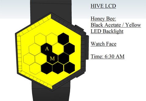 This LCD watch design concept is based on the interlocking hexagonal cells inside a honey bee’s hive. The time display is split into several time sections and divisions.