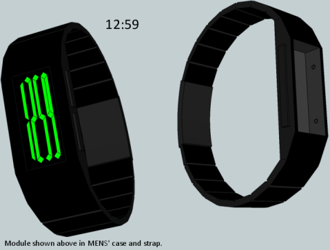 Heather says: The last TF Blog Progress Report expressed interest in new technologies, such as EL sheet, which is somewhere between LCD and LED. At first, I just wanted to make a cool looking unisex design with vertically stretched always on glowing numbers. When I designed the numbers, they appeared to me like they were being squeezed together from the sides, like they were in a vise. So I named the concept VISE. Then I thought about what a vise actually does, and I realized that this concept can go further. I can solve the problem of watches being too big/clunky for ladies.