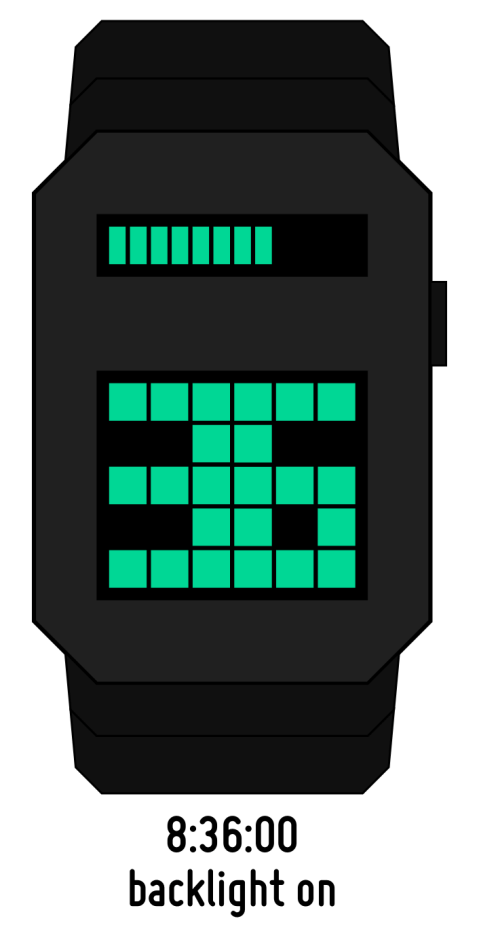 This is a development on Laszlo’s previous watch design “Baransu” except the blocks that make up the interface are diagonal instead of horizontal. This ensures that the display is completely full of LEDs. The time is displayed as graphics and there is no other decorative element.