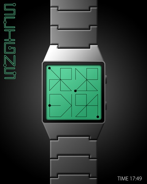 Lloyd says: This concept LCD watch design is called “Scigns” due to the strange, alien-like hieroglyphs used in the display.