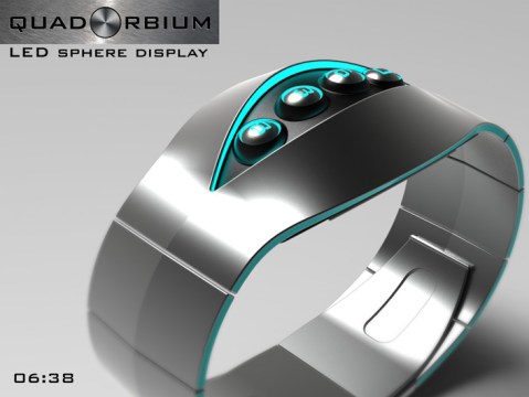 Heather says: I was thinking about how I could make a flat LED display appear 3D, and it occurred to me that I could give the appearance of a sphere by using some curved lines. Then I broke up some of these lines asymmetrically to form four digits, each comprised of 5 rows of 3 dashes.