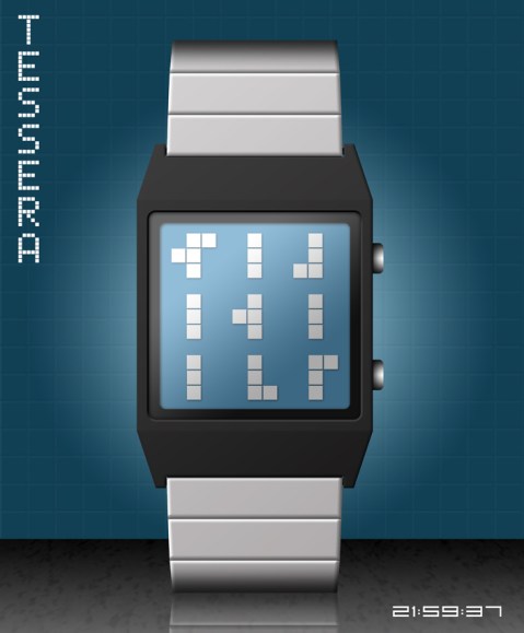 Lloyd says: This LCD concept watch displays the time and date using an enigmatic-looking arrangement of shapes made up of squares. That’s why it’s called “Tessera”, after the small square tiles used to make mosaics.