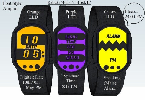 Andrew says: Kabuki (4-in-1): is inspired by the LED Helmet masks worn by the french electronic music artists: Daft Punk. But instead of using LED’s this display uses a touch screen LCD or E-ink Display & is constructed various bracelet materials each with up to eight LED colors options each to choose from: Blue, Cyan, Green, Orange, Pink, Purple, Red, or Yellow.