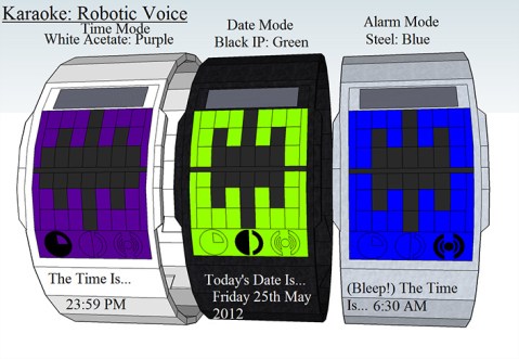 Andrew says: Karaoke a speaking watch that features a LCD or E-ink display screen. This design inspired by the Speaking Clock telephone service which anyone can call on the telephone & find out the correct time: United Kingdom. This watch come preloaded with the official language of your country of origin further languages & guest voice can be uploaded from the Tokyo Flash Website via a USB port/ cable.