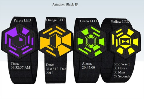 Gabriel says: I do not have a particular inspiration for this concept but as the clock display resembles a spider web, I thought to name it “web”. The watch has 60 segments that light up and in center a digital numeric display.